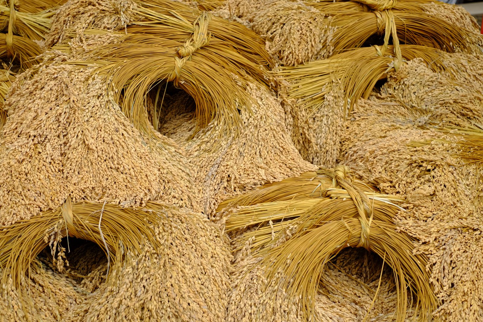 Minority village visit. Rice ready for processing.