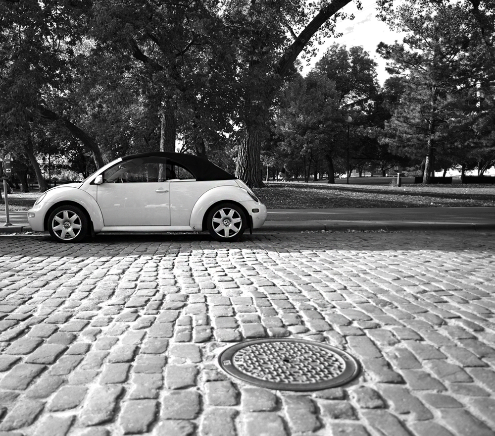 I just thought the perspective of the street had a neat "conversation" with the curves of the VW Beetle, and the man hole cover being round, but with texture, seemed like an hors d'oeuvre.