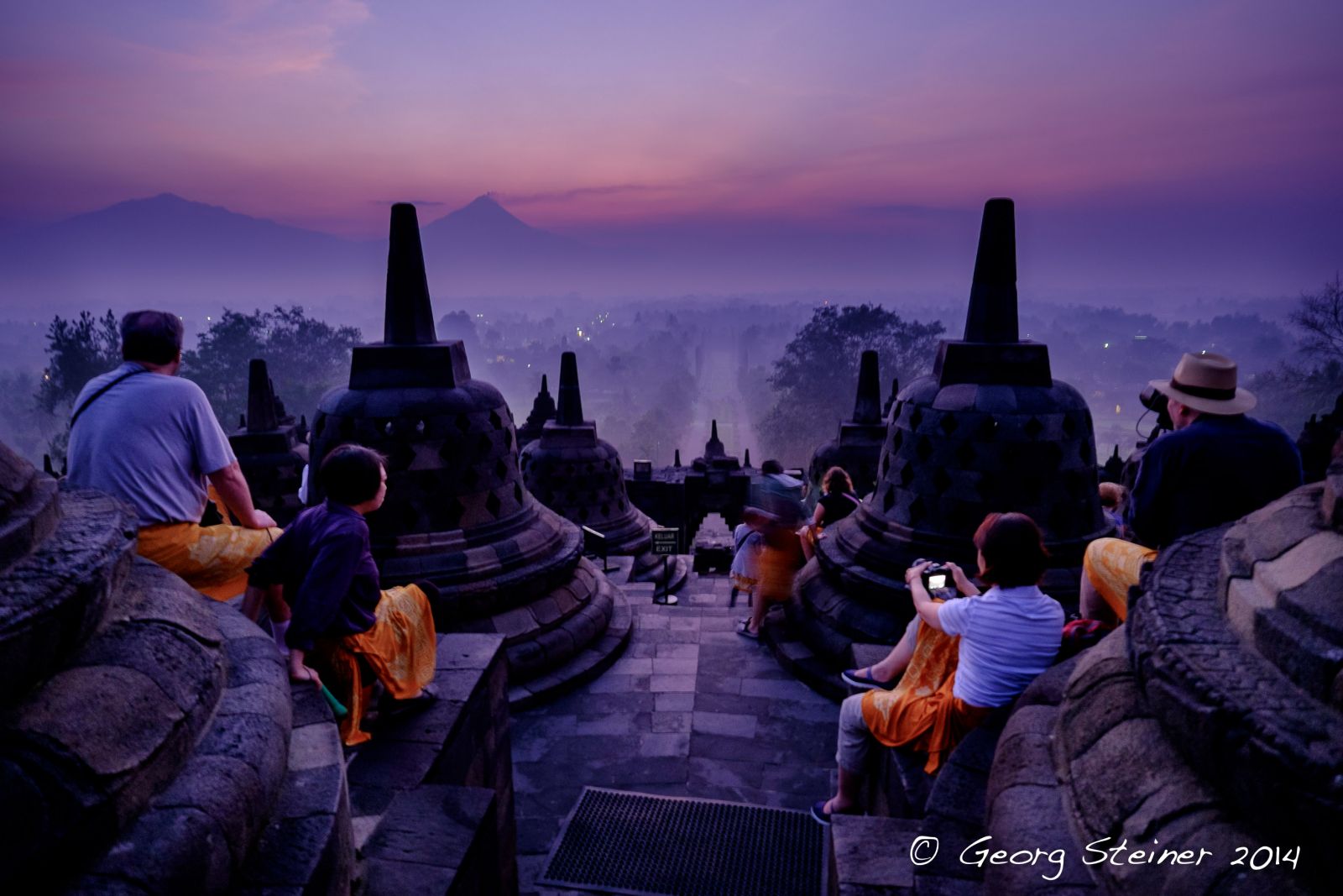 Before sunrise, Borobudur temple, Java, mount merapi volcano is active in the distance