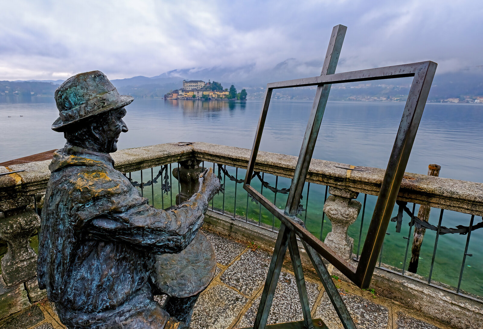 Bronze statue of a painter who portrays the lake and the surrounding landscape.
