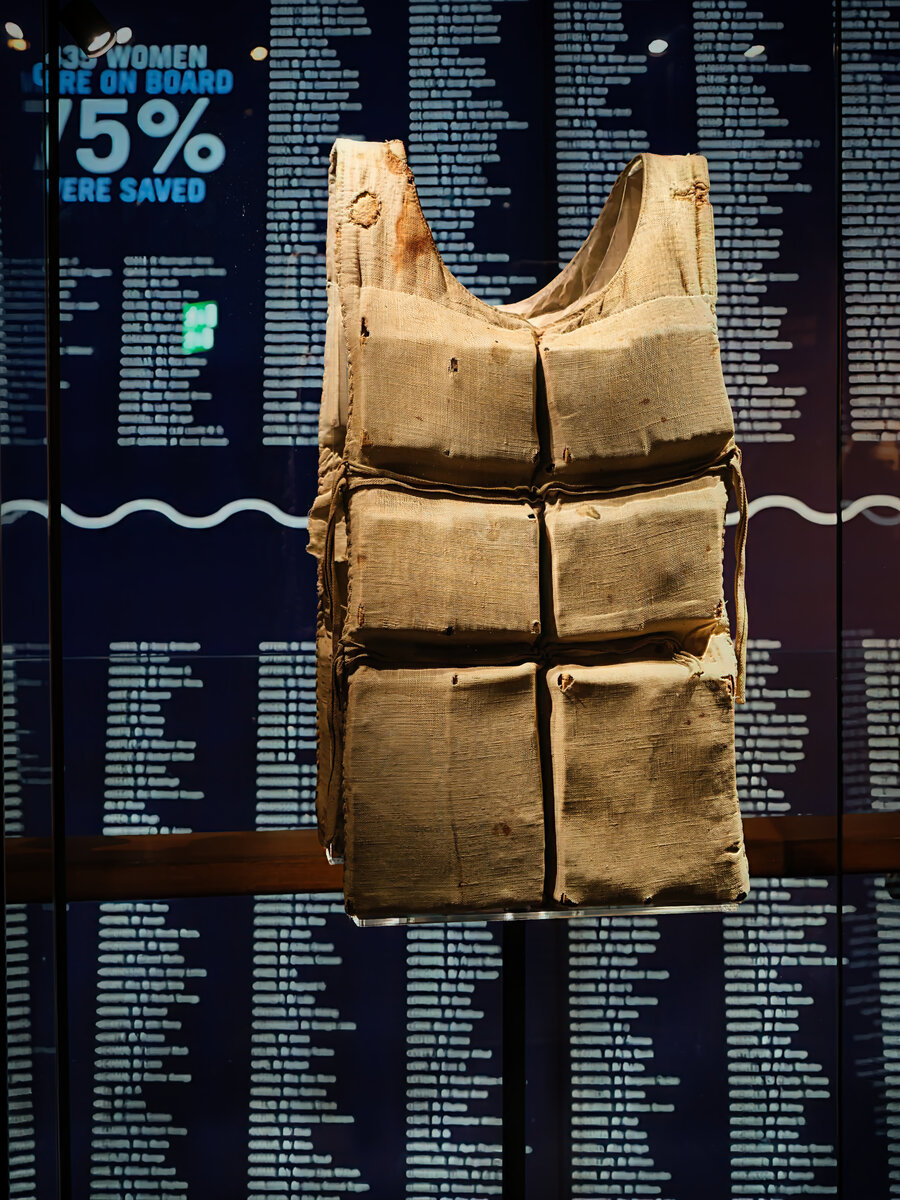 A lifejacket taken from the body of a victim of the Titanic sinking. In the background are some of the names of those who perished. Taken at the Titanic Centre in Belfast.