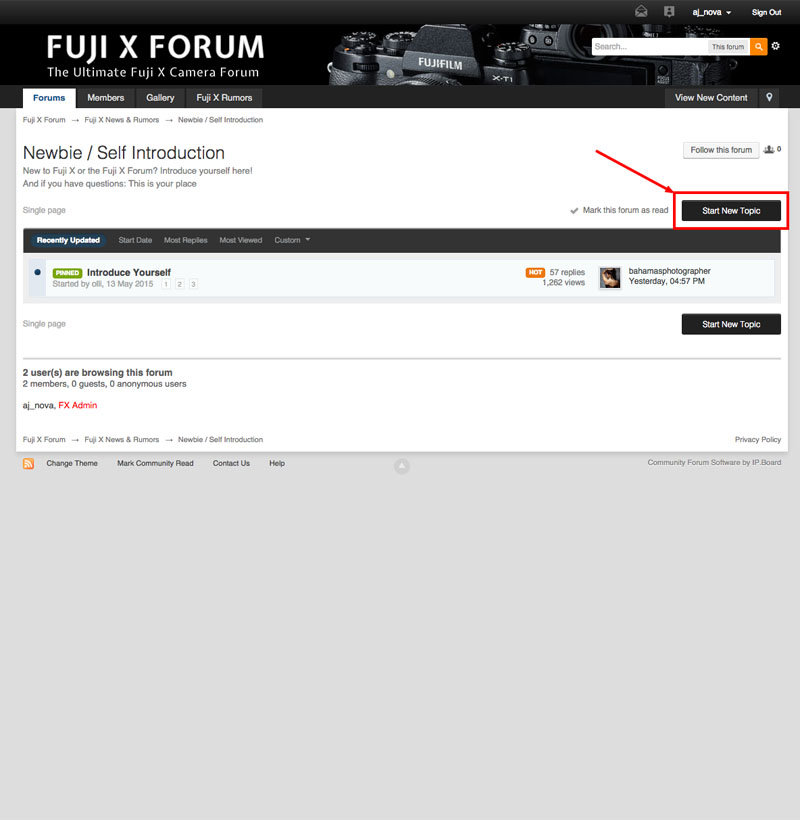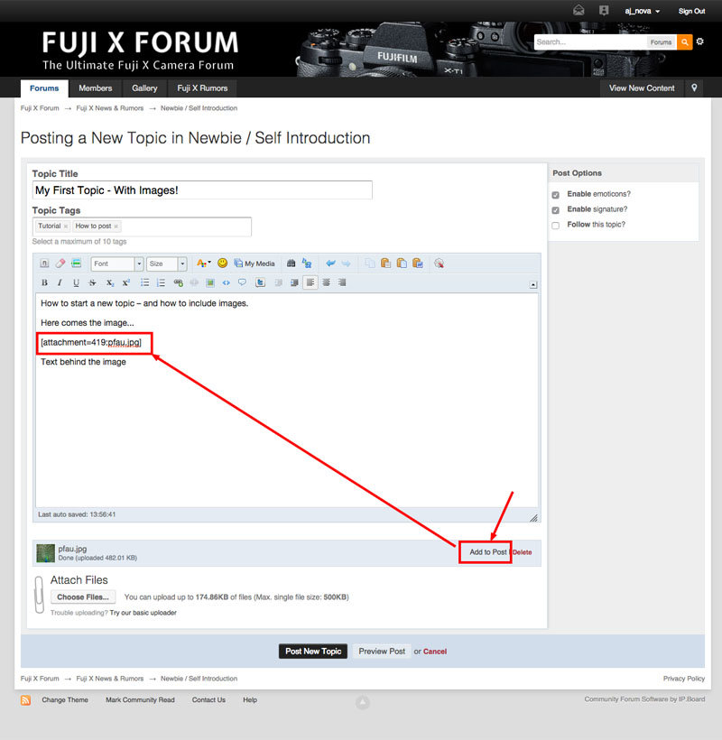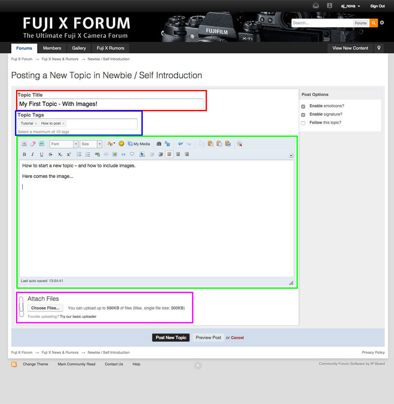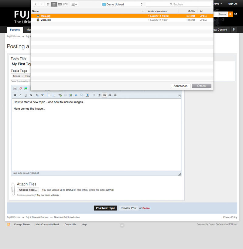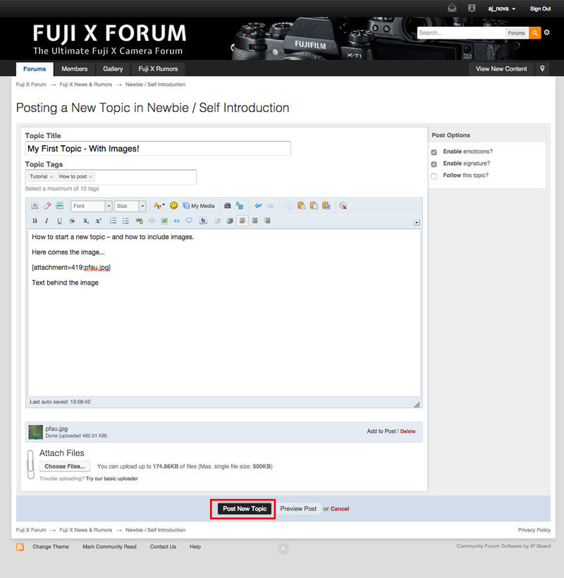 11. Here is a short tutorial how to start a thread in the Fuji X Forum - including how to post images. If you still have problems or you have suggestions how to improve the tutorial, please let me know! Comment below or send me a message. Step #1: Find the right forum Let’s take the Newbies Forum as an example Step #2: Create Topic Click here please „Start New Topic“: Step #3: Enter Content Each thread needs a title (red) and content (green). If you want to include images, you have to click „Upload file“ (pink) below the text. If you need no images continue with step #6. Tags (blue) are helpful to recommend other threads with similar topics. Step #4: Choose one or more Images for Upload Step #5: Add Image to Post If you don’t take this step, your image will be appended at the end of your post. This is how to add your image at the right position: Step # 6: Publish Thread When you are done, click „Publish Thread“ Done! This is how this contribution would look like - here is it live: Question? Suggestions for improvement? Comment here or send me a message! Andreas