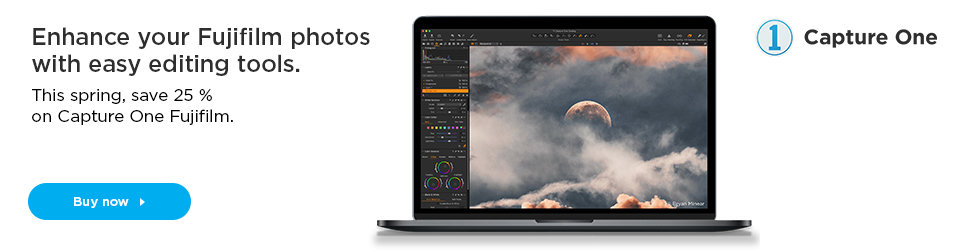 25. Buy Capture One Fujifilm 20 now and save with the voucher code SPRING25! Until March 31, Phase One is offering a voucher code SPRING25 on the Fujifilm version of the Capture One 20 RAW converter, valid for perpetual licenses as well as for the subscriptions. By the way: the newly released version 20.0.3 also supports Fujifilm X-T4 and Fujifilm X100V! » Capture One Fujifilm 20 (save 25% with code SPRING25)