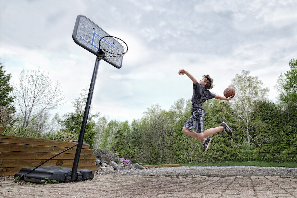 Another shot, but this one not staged. Indoor arena of my son taking a shot on net. Lighting in this arena sucks, so fast glass and pushing the ISO is needed for still. Video isn't a problem in the lighting as 1/30 or 1/60 shutter speed is easy ... but not 1/500 !