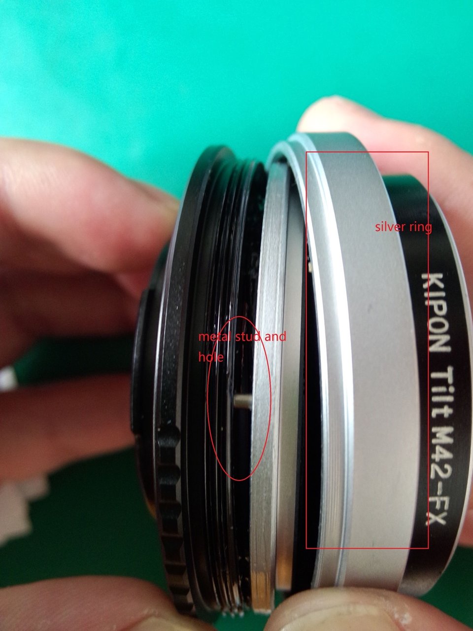 never mind, I’ve solved the problem on my own and for the benefit of others I will add here my findings. I didn’t have too much time to use the adapter after buying it and there was something that was bothering me a bit. Even tightening it well, there was still a little “ wiggle” of the lens after everything was the way it was supposed to. At first I thought it was a problem which I had and addressed and resolved with the help of Kipon staff. If you by mistake screw this off completely you need to reassemble it by aligning the studs of the front section to the hoses of the back section. Having done this, you then tighten the front to the back sections with the screw in ring making sure that the studs stay in the holes. If you don’t do that the adapter will never lock. But mine was locking and still there was a minute wiggle. I had written the original owner who told me that this was normal but I wasn’t convinced. So, I took a look at the adapter again. Those 4 screws, they attach the M42 ring to the adapter and probably any version of the adapter has a different ring allowing the proper lenses to be fitted to the adapter. I screwed those off. Under that there are 4 more screws and they were a little loose. Tightened those... et voilà ! Everything as tight as a drum.