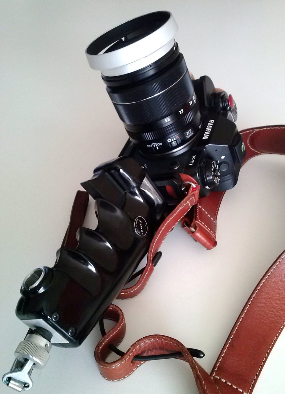 Long ago, when I had a Rolleiflex ( I’ve had a few) I learned the obvious advantages of using a pistol grip especially in combination with a prism which changed the use of the camera from waist level to eye level. This made a much more solid grip with a camera that is essentially a box. I’ve been thinking for a while to do the same thing with my X-T1 and I was trying to buy one of these ( there are many cheap ones on the market) when I was actually given one which may have been originally having a shutter release or perhaps was used on a film camera like a Super 8. So here it is, apologies for the quality of the pics, obviously made with a not so good phone ( I don’t need a good phone camera, I am a proper photographer after all!). There are obvious advantages in using this both for portrait shooting position ( vertical) or landscape ( horizontal) when one, like me, has chosen to use a Lplate. You could, if you want to do this even faster, use an arca-clone plate on the grip and then switching would be a snip.