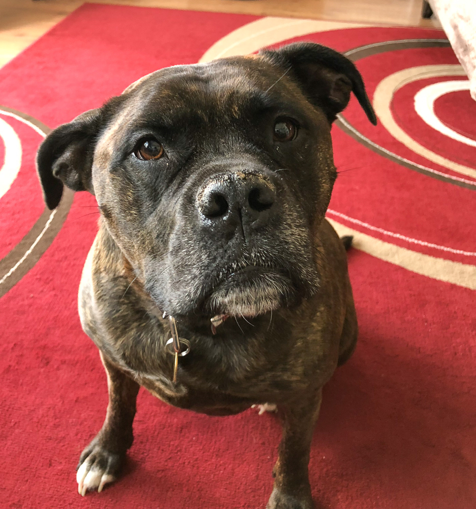 My daughters dog Ruby a Boxer/Staffie misgiving me a please give me look because I've got a bag of treats. iPhone x