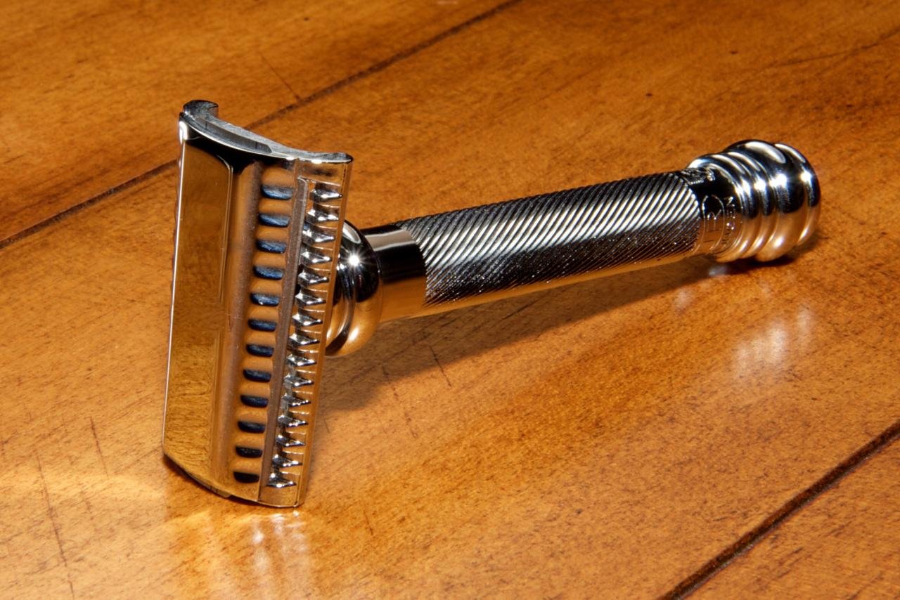 This is my daily kit: a Megress adjustable, ceramic scuttle, and brush de jour. I've upgraded to a butterscotch Vie Long brush that's a real favorite. For two days' growth I use this Merkur Slant.