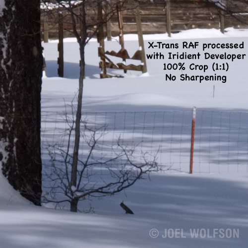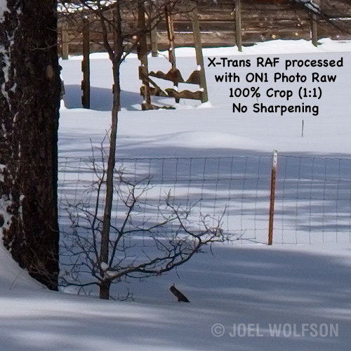 Iridient Developer does render slightly more detail but as I noted in the comparison you can really only see this pixel peeping at 100% view. I also consider the final use (large prints, online, small prints, etc.) and overall workflow for a real world perspective on this (see my section Keeping it all in perspective.) I'm including another 100% crop here so you can see another section of the fence. Some of what you're seeing is the wire in the fence itself, which is actually somewhat jagged. I also provided these crops without sharpening. Normally I do capture sharpening on every image. It looks to me like Photo Raw has a tiny bit of sharpening inherent in the raw extraction so it appears a little bit sharper and the ID version is a little smoother looking. Consequently I would do less capture sharpening with an ON1 Photo Raw processed raw file. As it turns out the default sharpening in ID is just about perfect and in the end, if you're making prints, you're not going to see a difference anyway. I think these samples are an interesting comparison. I'll let everyone know when I do my printing comparison from the different raw processors.