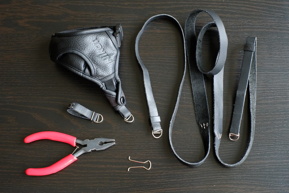 Some time ago I've decided to made custom metal hooks. They can be released in a second by rotating 180 degrees with putting extra force in the middle. These hooks are made of very strong spring steel, used for bulldog paper clips. So they are very durable, and didn't fail for more then year of use. That time I often switched finger/wrist/neck strap, and it was the most compact solution I could find. Later I've realized the slim leather strap is most often used. So decided to attach it firm without extra parts in the following way. -