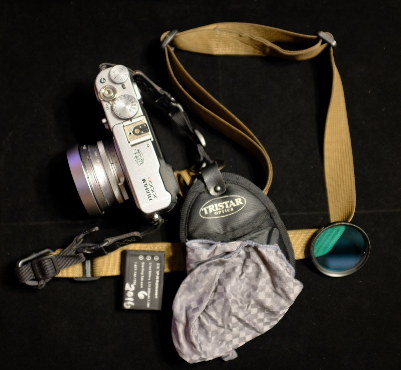 I like to travel really light, with only the camera and no bag. I found these Tristar filter pouches on eBay that were really cheap, including filters that I didn't even use. I keep an extra battery, combination lens cloth/white balance background, and filter. If the filter looks odd, it is a HOT filter that blocks infrared and allows taking visible light images with my modified IR/Viz camera.