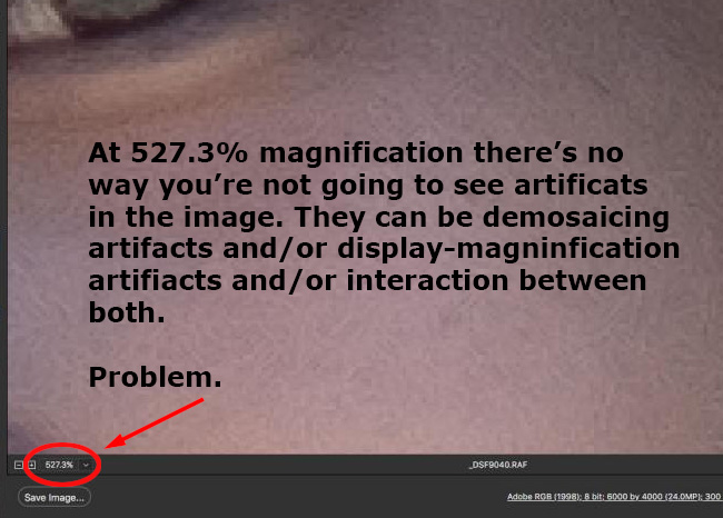 16. Given the structure of the X-Trans CFA I can imagine that you're looking at demosaicing artifacts in the squarish pattern that you're seeing. X-Trans is more prone to artifacts in the demosacing process than a Bayer array, but you must understand that all demosaicing of CFAs produces artifacts -- no option exists not to do that and at 527.3% magnification no option exists not to see them. Just remember that at 527.3% magnification you may also be seeing artifacts created by the software enlarging your image to that size and/or an interaction between those artifacts and the demosaicing artifacts that you can no longer really see because of that interaction. Look at the photo on screen at 100% magnification. Does it look OK?
