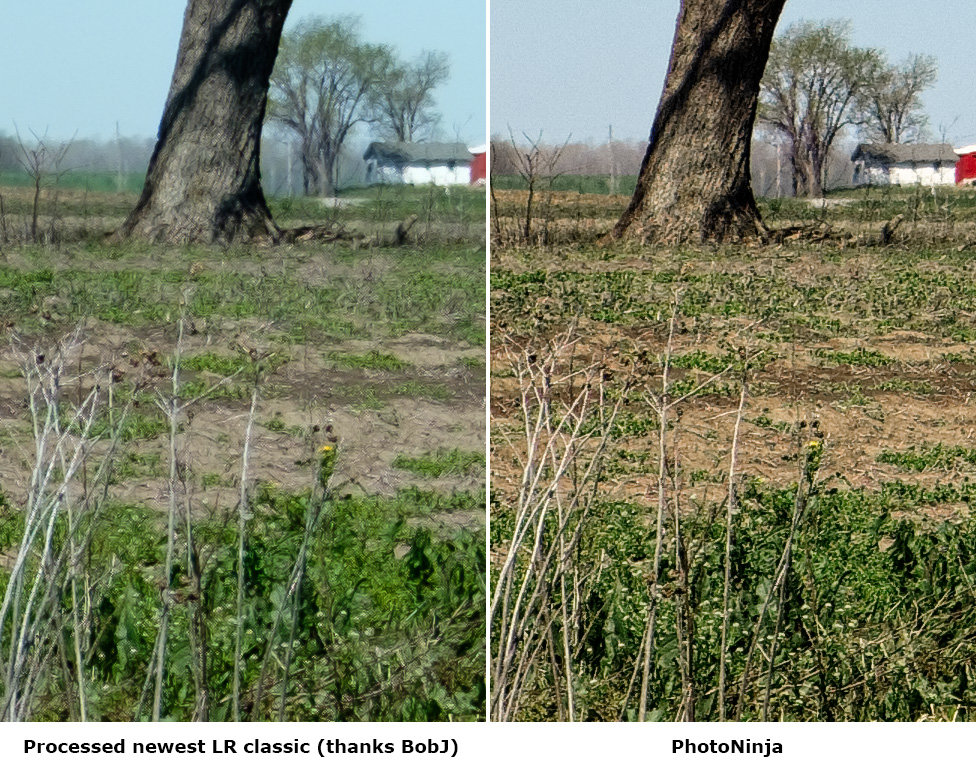 9. BobJ sent me an LR processed version of the RAF file I posted. Here's the link he sent me: https://www.dropbox.com/s/o5juwj1mcbptuba/_DSF0648.tif?dl=0 I'm seeing the same old LR and the same old poor fine detail rendition with Fuji RAF files. This RAF file is from an X-T2. Below is a side by side of a section of the image at 100% -- the file BobJ did and a version run through PhotoNinja.