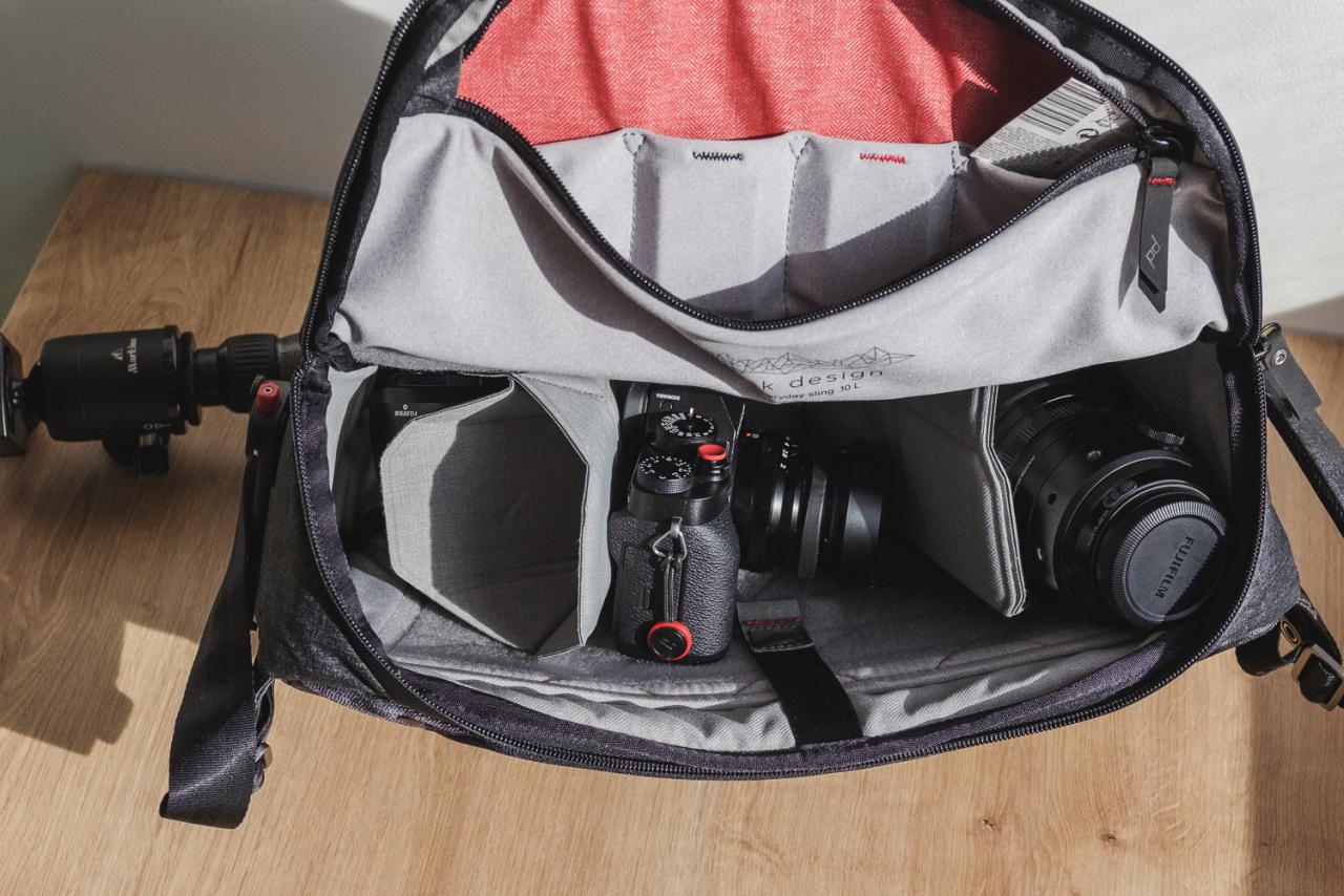 Yesterday I had the X-T2 with 35f2 attached, 16 1.4, 50-140 and a battery pack in it, with plenty of room to spare. I could easily have taken the X100T as well. The 50-140 fits perfectly standing up. I liked the Everyday Messenger too, but felt it was too big. This one is far more suited to mirrorless systems.