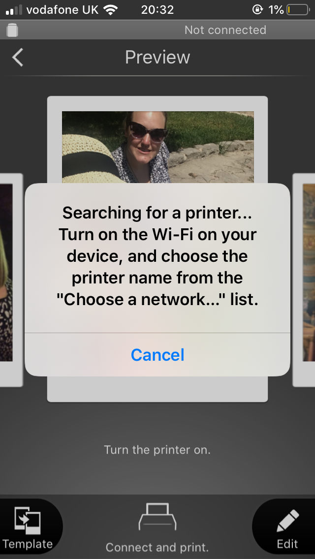 1. Same problem! It is connected onto the WiFi but every time I try to print a photo it tells me to connect to the WiFi!! Have tried turning it off and on again, charging, turning off WiFi and back on again! Connecting is no problem but the app won’t connect to the printer!