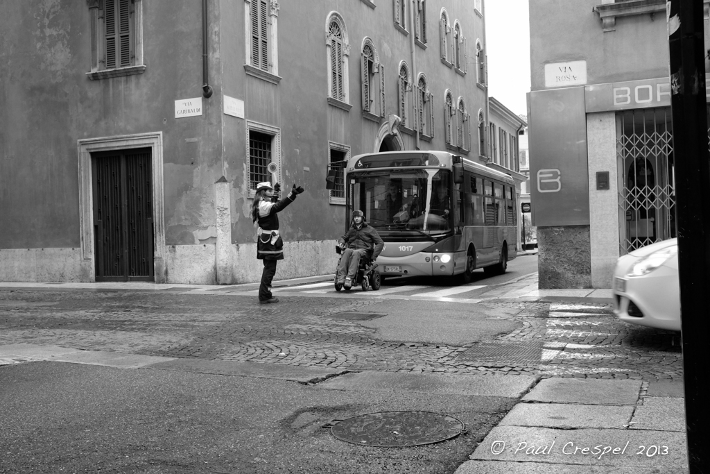 18. Hi Stefan, thanks for your comments Finally somebody has thought about the images! Ok, here's my reply: The 4 guys behind the bench were not posed. None of my photos are ever posed, nor are they cropped, straightened or manipulated in any way. Those guys were sheltering from the snow under a tree, behind a bench. I had passed that bench hundreds of times and never seen the graffiti, because there were always people sitting there. I saw the guys from 50 metres away, and as I drew level I turned, went down on one knee, and shot... and at that moment I saw the graffiti for the first time. The graffiti is a protest against the metal bars Verona has placed on all benches to stop homeless people sleeping on them. The bus and the wheelchair.... the bus won, the driver refused to move to one side, and the pavements were too narrow for Cristian to mount, so he had to turn around and exit the road with the bus following. At that point, to add insult to injury, a police woman on point duty, held her hand up and made him stop to give way to traffic coming the other way.... I have that photo too The old man sitting in the street was not a performer. He was very still, and the people didn't understand, and they believed he was dead.... so the photo shows human reaction... instead of trying to help, they all just stared at him with disgust / horror / fear. Dumitru, shaving in the park, is Romanian. He comes to Italy for 6 months every year. He has a nice house and family in Romania, but he chooses to live rough in Italy for 6 months and busk with his guitar and send the money he earns home, where it keeps his family in luxury, and where it will support him when he returns for the winter. Those buskers earn between 100 and 200 euros a day. Nutella. Cause and effect. Instead of selling the fried donuts, she was eating them. Nun kissing priest, full on the lips, for over 10 seconds - very early on a Sunday morning, very few people around, two other priests seemingly looking out for them. The boy playing the violin.... Patrizio.... 9 years old. I asked his "minder" why he wasn't at school, and she told me that he has to work because he is clever, and can earn more money than she can. They are Rom. He was capable of playing 40 seconds of one classical work, and then demanding money. It was slave labour. I spoke to both of them, the woman was proud of what she was doing, but Patrizio wasn't happy. In this series, the only truly homeless person is the lady with the blankets. It was taken on a Christmas eve morning, very early, in Verona. I didn't speak her language, and she didn't speak any of mine, but she enjoyed a good breakfast, and hopefully had a better Christmas than she was expecting. It's nice to finally see people think about the images, thank you