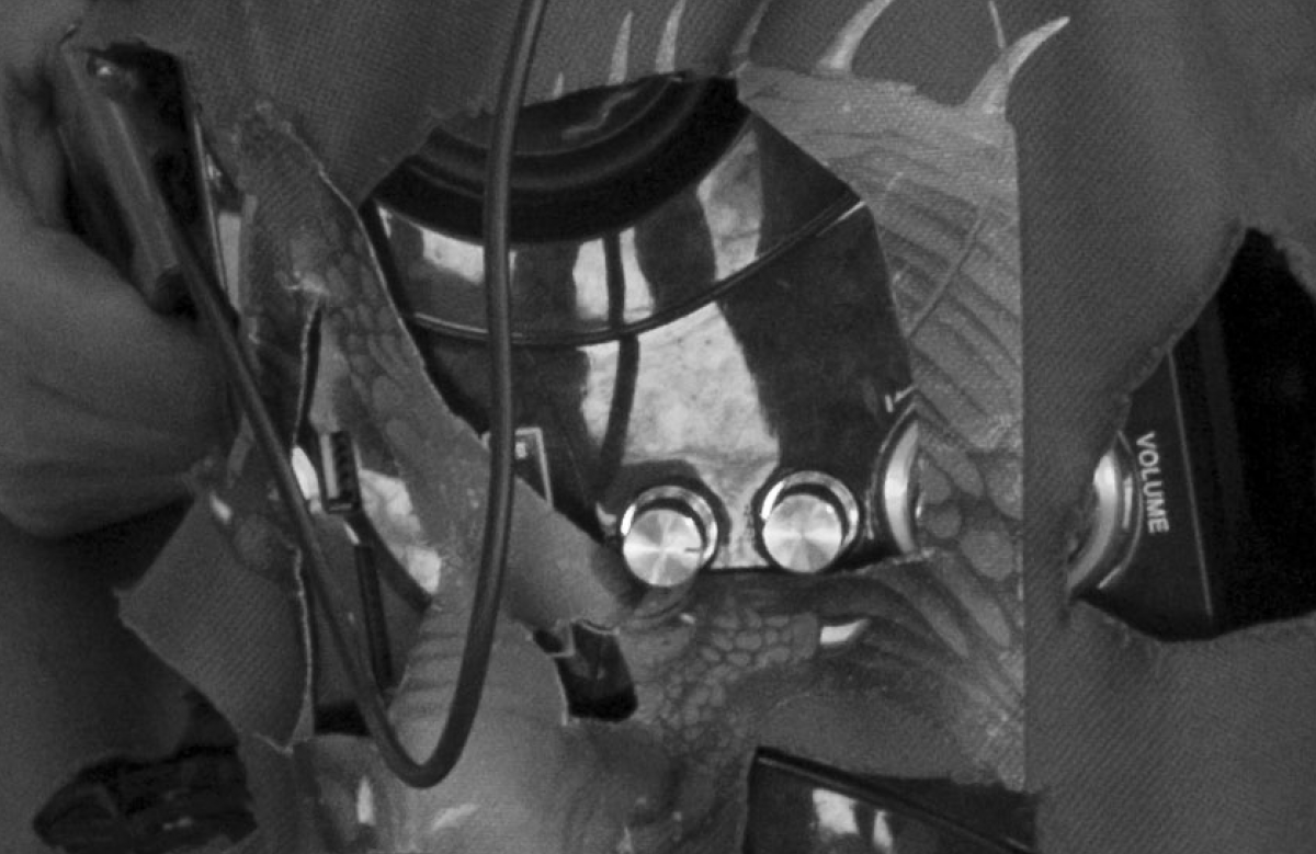 4. Ok, let's return to the 9 year-old violin player. I was hoping that by now somebody would have looked at his minder's rucksack, strangely worn in front of her. Doesn't it appear that holes have been cut out, and it's hiding a loudspeaker? If you can't see these things in other people's photos, how can you possibly see things that you choose to photograph? Here is a 100% crop of the rucksack taken the same day showing an MP3 music player connected to an amplifier and speaker in the rucksack: