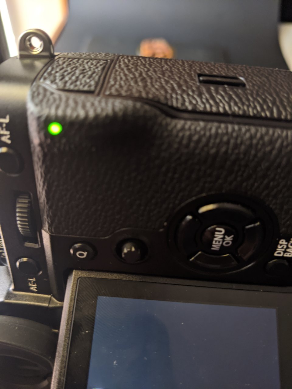 I just received my XT3. When I take a picture, the green back light starts to blink costantly. When it does it, I can change everything exept the front dial, which I'm using it to control the ISO.