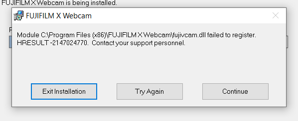 1. Hi Not sure if I'm in the right place for this, if not please point me in the right direction. I want to try out the Webcam X software to use my XT-3 as a webcam. I have downloaded and run the installer but I keep getting the same issue. I get a pop up message that reads "Module C:\Program Files (x86)\Fujifilm X Webcam\fujivcam.dll failed to register. HResult -2140024770. Contact your support personnel." I then have the options to exit installation, try again (same box pops up), or continue (tells me the software is succesfully installled). I have uninstalled and reinstalled. I have switched everything off and back on again! When I set up my X-T3 as per Fuji's instructions it doesn't show up in the camera drop down box in Zoom, so I'm assuming that this error message means something! I have double checked the necessary camera settings and they are as required. Googling "fujivcam.dll failed to register" hasn't brought up anything helpful. Any ideas? It's a Windows laptop, running fully updated Windows 10 if that helps? As I'm typing this it occurs to me that do I need to have the firmware on the camera bang up to date?
