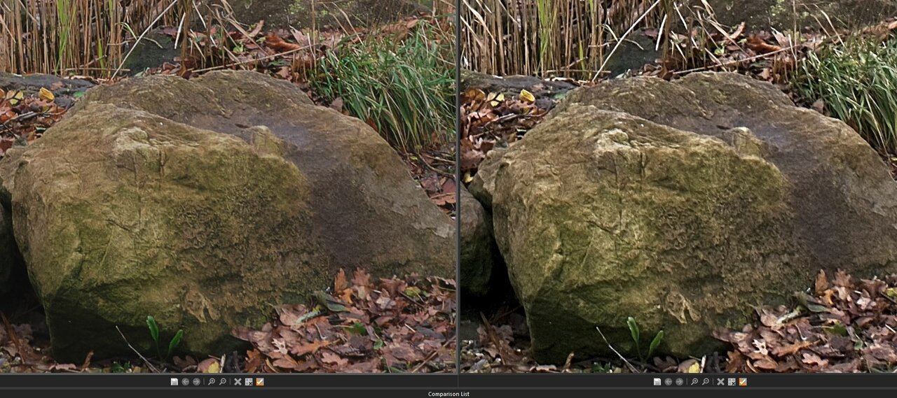 Comparing On1 and Capture One. There seems to be much concern about which software does a good job of Fuji files. Having decided to use On1 2021 I decided to compare a raf file (Fuji X-S10) with minor editing between these two editors. The photo in question is quite dull in keeping with the weather. I only did the following to the file in both editors: Pushed out the whites and blacks for max dynamic range Boosted Structure (to 40) Sharpened. Having edited the file in each editor I exported the raf file as a full size jpeg and then compared them side by side in ACDSee Ultimate at 100%. The attached comparison image was captured using ACDSee Ultimate at 100%. The Capture One image is on the left and On1 is on the right. I concentrated on the rocks as this is where I thought there may have been a problem. I see no noticeable difference. I hope this is of some interest, Dave.