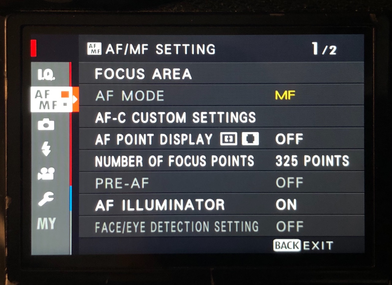 For about two weeks now, my shutter release has not been initiating focus when half-pressed. After lots of menu-diving, and resets to both my setup and shooting settings, I still can’t figure out what is going on. From other forum posts I’ve read, I suspect the focus select dial (M/S/C) on the front may be broken. The AF/MF menu now has several options that are grayed out including AF Mode [stuck in MF]. My lens doesn’t have a focus clutch either (23mm f2) so I really can’t think of anything else that might be occurring. Any ideas?