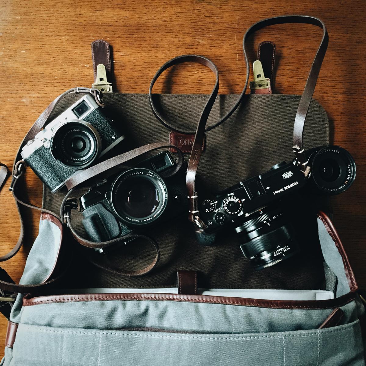 A lot of great options listed in this thread. Another option is taking any messenger bag and getting Domke or Tenba inserts to protect the lenses. I love my Ona "Union Street" bag, which holds my 3 cameras and lenses, batteries and chargers. My bag holds: X-Pro1 (x2) with lenses mounted X100s 14mm f2.8 23mm f1.4 56mm f1.2 TCL-X100 11 batteries 2 chargers iPad Air (15" laptop would also fit in the padded interior slot) I'll still be able to cram the 90mm in a compartment once that arrives, but no room for a 4th body... -