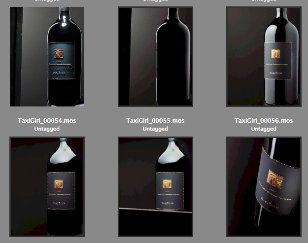 Let's take this finished shot. It's a screenshot by the way and I boosted up on a curve so you can see them better. And then the raw files I took of the bottle so I could composite later on. The background was chosen by the client. You can see in #58 I was using a fill card in the shot only to light up the word Darioush better than I could in the other exposures. It's way things are done now. Yes, I could light the old way, I did that from 1982 -2001 exposing tens of thousands of sheets of 8x10 and lighting it the old fashioned ways. But then you could only do one or two of those a day. You'd spend half a day lighting one bottle, rush a sheet of film to the lab, wait an hour to see it and if it was good then you'd move onto the second shot of the day. If it wasn't then you'd light some more, rinse and repeat.