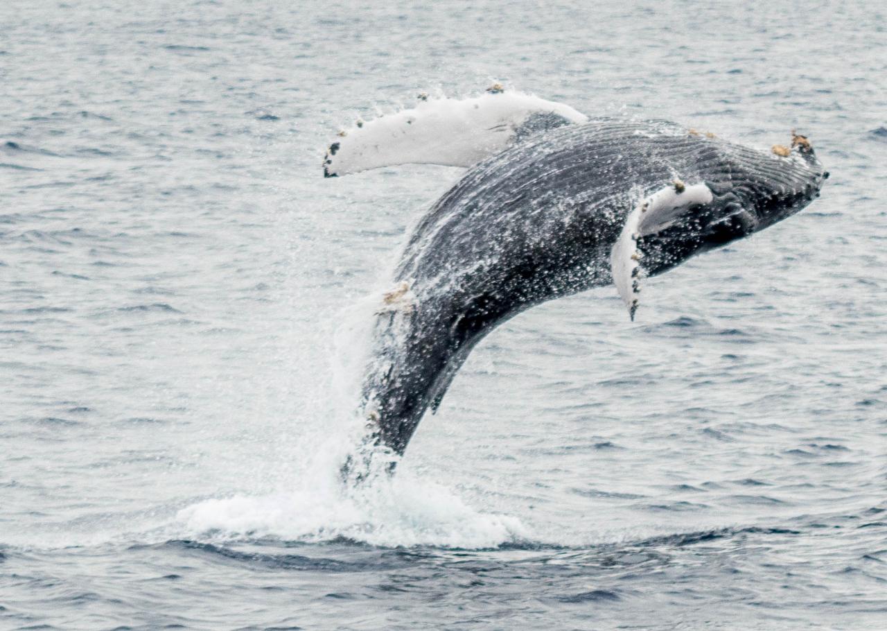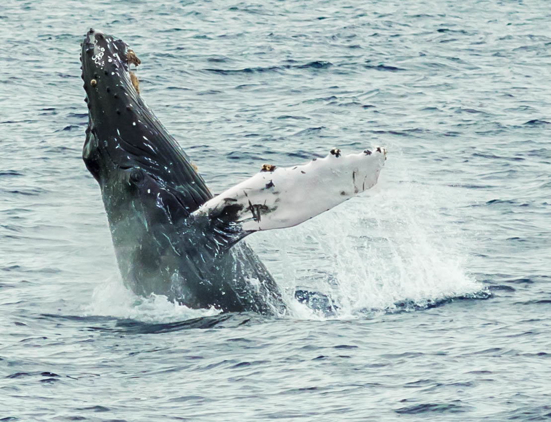 Nice shots. Breaching whales are really hard to get. They just appear somewhere and are gone quickly. Aiming the lens focusing is pretty much impossible. Here are some of my mine. It took hundreds of pictures to get some decent ones.