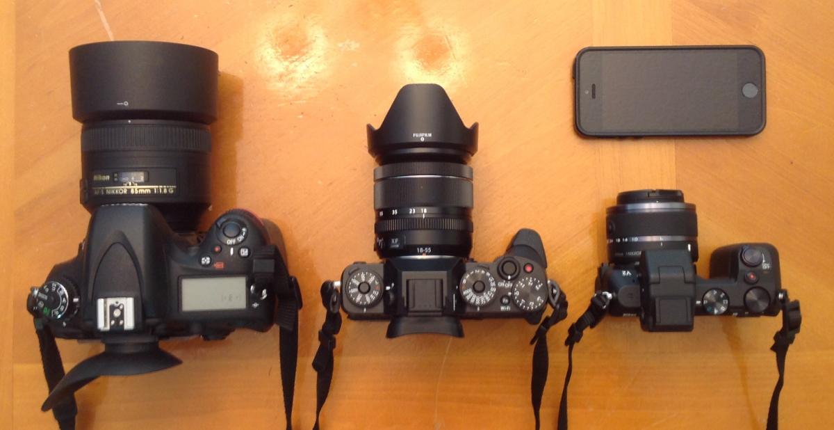 24. my cameras vs grip sizes. from left to right (i.e. largest to smallest sensor). Nikon D600 (Full Frame), Fuji X-T1 (1.5 crop) w/ normal optional grip, Nikon 1 V2 (2.7 crop). iPhone 5s (7.21 crop) for reference.
