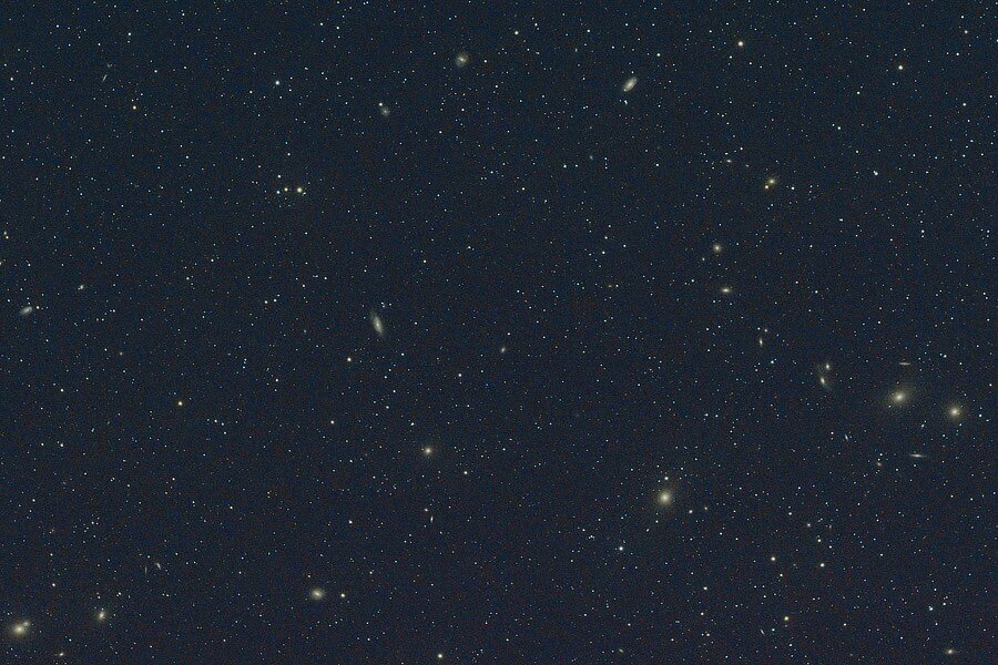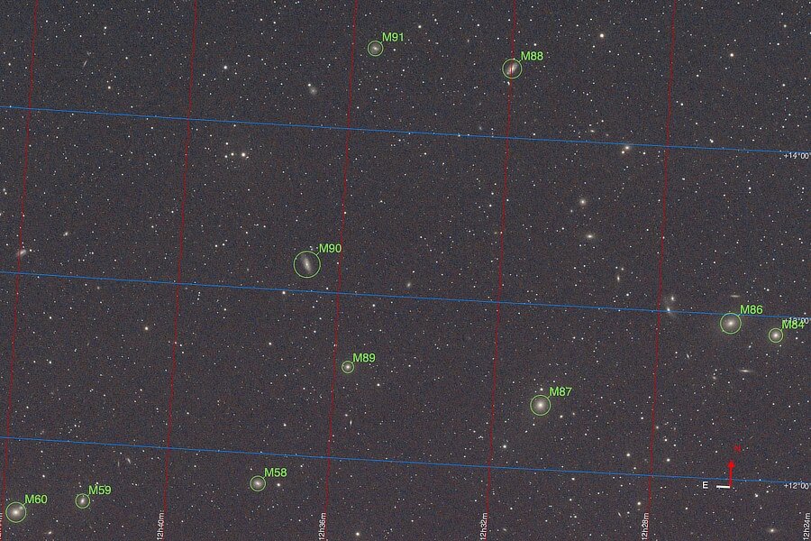 East of Markarian's Chain... Back on page one of this thread, there is a posting for Markarian's Chain, a swooshing line-up of galaxies. The sky east of the Chain is also filled with many wonders: (On the right starting with Messier Object M84 and swooshing upwards towards the left is the Chain.) This is the equivalent of 32 minutes of exposure. https://www.messier-objects.com/markarians-chain/