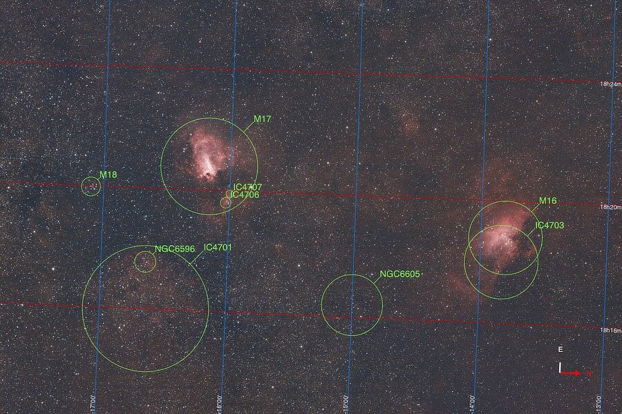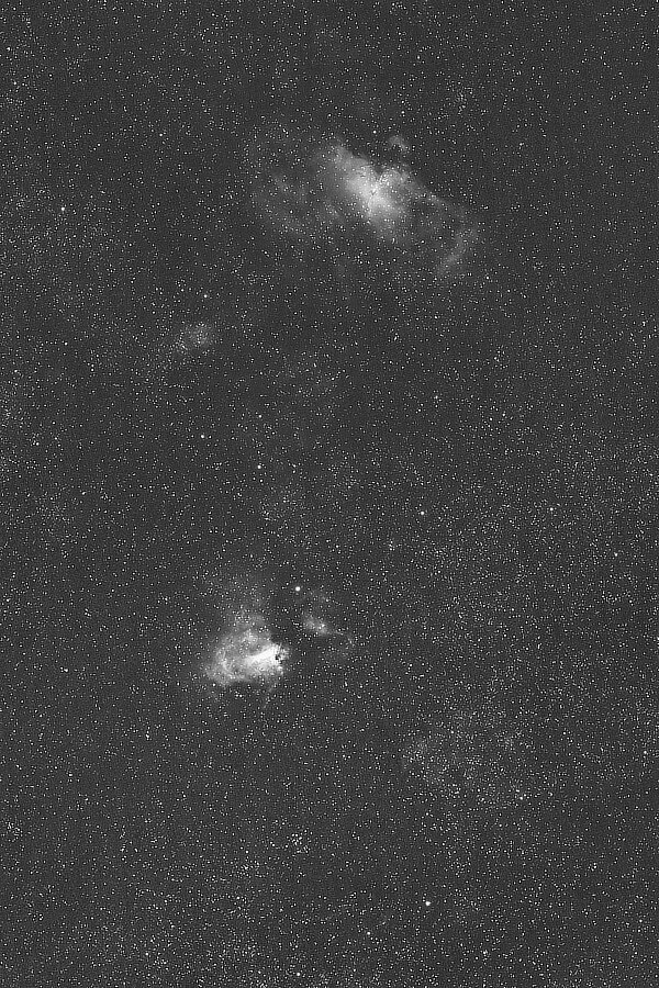 The Eagle and the Swan (or The Star Queen and The Lobster) ... Messier Object M17 a.k.a. The Omega Nebula, The Swan Nebula, The Horseshoe Nebula, The Checkmark Nebula or The Lobster Nebula is a colorful late summer nebula in the Sagittarius Constellation. In dark locations, you can see this one without needing binoculars or telescopes. Messier Object M16 — this is one of those deep sky objects that is one thing (a star cluster) but due to the surrounding other stuff (Hii region) the surrounding stuff’s fame causes everything in that region to go by the famous name. M16 (cluster) and IC 4703 (Hii region) together go by the name The Eagle Nebula or The Star Queen Nebula. The is where the famous Pillars of Creation are located. This is the equivalent of 37 minutes, 40 seconds of exposure. https://www.go-astronomy.com/messier.php?Messier=M17 https://www.messier-objects.com/messier-17-omega-nebula/ https://science.nasa.gov/mission/hubble/science/explore-the-night-sky/hubble-messier-catalog/messier-16 https://www.messier-objects.com/messier-16-eagle-nebula/ Part one of two.
