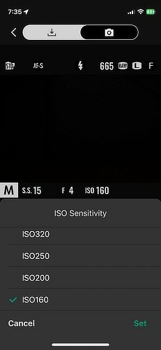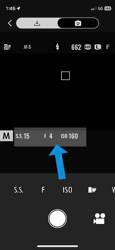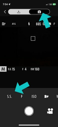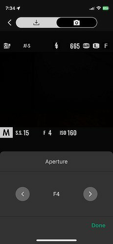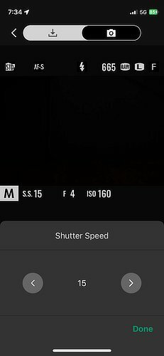 19. For this demo, my trusty X-T30 volunteered its services: I am assuming you were able to get the app up and running on your phone and got to the start screen. Click on the Image Acquisition / Photography button. Doing that should take you to this screen: The top part has two choices, make sure the one with the camera icon is chosen. Then below the current exposure listings are the icon buttons to change the settings. Choose S.S. to bring up the Shutter Speed screen: Use the left or right arrows to change it. Click Done when you are finished. You can change the Aperture setting by choosing the "F" icon button. Similarly, you can change the ISO setting: I will leave it to your adventurous self to explore importing images: And that is it for the basic exposure settings, as you can see there are other settings to change or leave alone. i hope this helps.