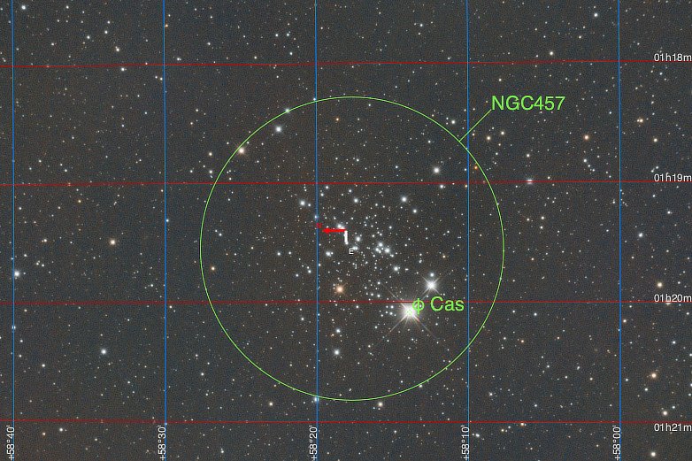 20. A Dragonfly, ..., An Owl, ...., ET! Located in the Cassiopeia constellation, NGC 457 is known as the Dragonfly Cluster, or as the Owl Cluster or as the ET Cluster. 'Ol Dragonfly can easily be seen in the Northern Hemisphere this time of year with low powered binoculars. This is the equivalent of a 95 1/3 minute exposure. https://freestarcharts.com/ngc-457 https://astrodoc.ca/ngc-457/ https://themcdonalds.net/finding-ngc-457/