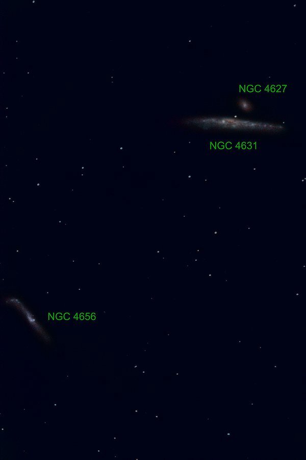 Of a Whale, a Calf, and a Crowbar... NGC 4627: The Calf (aka The Pup) Galaxy: https://en.wikipedia.org/wiki/NGC_4627 NGC 4656: The Crowbar (aka The Hockey Stick) Galaxy: https://www.messier.seds.org/xtra/ngc/n4656.html NGC 4631: The Whale (aka The Herring) Galaxy: https://apod.nasa.gov/apod/ap040123.html This is the equivalent of a 110 minute exposure.