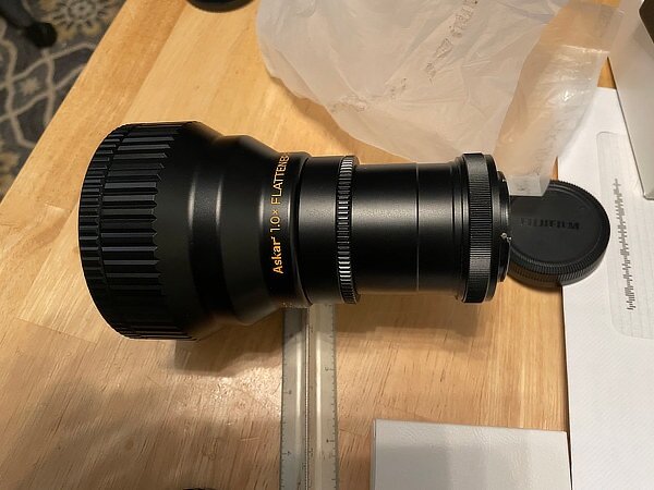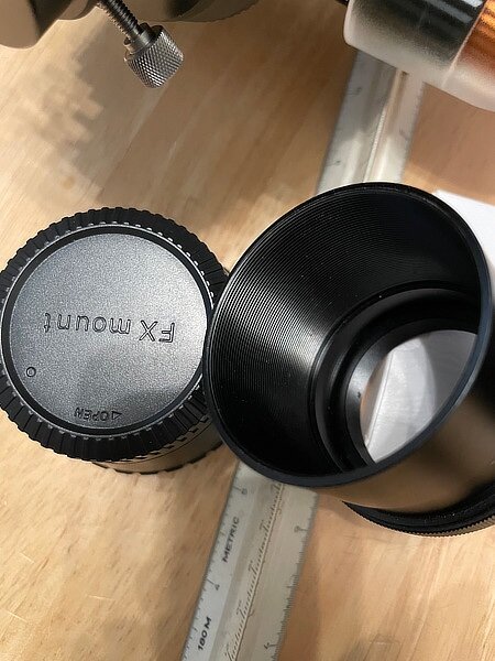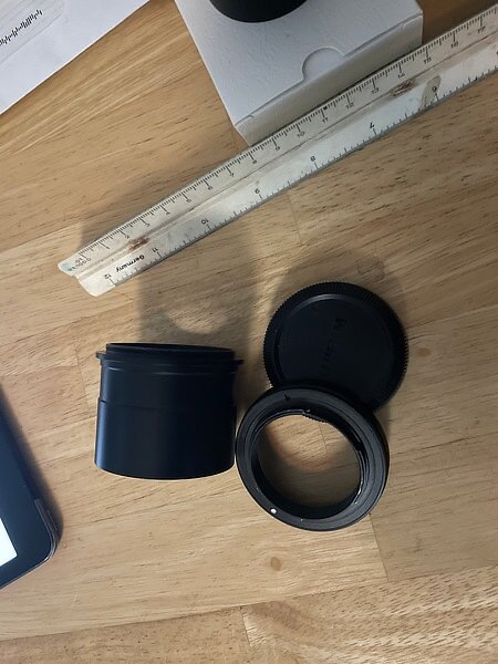 The M48 to X-Mount adapter with lens cap. The focuser. Loosen the three (screws / bolts) and remove the inner part. Inner part removed and some M48 extension tubes are added to the adapter. Just use long enough extensions for the focuser to hold onto the combination but not so long that when you put them into the focuser, it hits the secondary mirror. That will cause a lot of bad juju. (The small mirror at the top of your Newtonian is called the secondary). Adapter combination attached to my trusty X-T10. Slide the tube into the focuser, tighten the (screws / bolts) and you are good to go. -