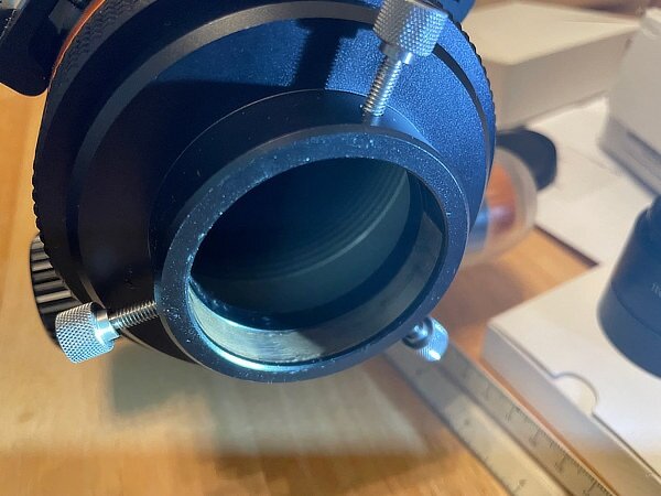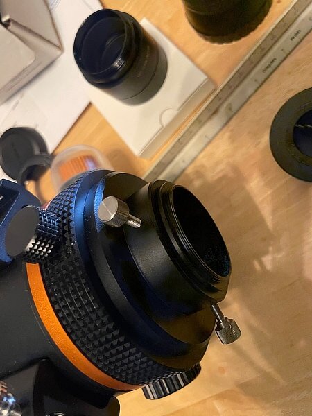 That is a little odd the threads are not matching. Usually the pitch is the same for those. 🤷♂️ Regarding that first thing I mentioned… That adapter is a bit of a multi-purpose adapter. I guess More Photos are in order: The inside is deeply threaded. This is typically what you would use it for to get your camera’s sensor into prime focus range. (I did not put my trusty XT cameras on this time so that they would not obscure the view. But ... the pieces come apart, so that you can use other extension tubes if you want to. (M48 threaded). Look inside your telescope’s focuser, your scope most likely has that brass ring sitting there. similar to the one pictured here. The three bolts / screws clamp down the ring onto the piece you put inside. You will have to trust me that the ring clamps tightly whether you use the wider or the narrower place on the tube. I do not know why the manufacturer made it like that, but it does work. [For what you are doing with your Newtonian, you would slide the tube all of the way in and then clamp it, or use a shorter extension tube.] edit: If I were to guess, I would guess that if the brass ring fits entirely inside of the indented narrower part of the tube, doing so would help keep the tube from slipping in either direction, and that makes sense, but that place is not the only clamp down spot, other telescopes with different back focus spots would not use that location to clamp the tube. -