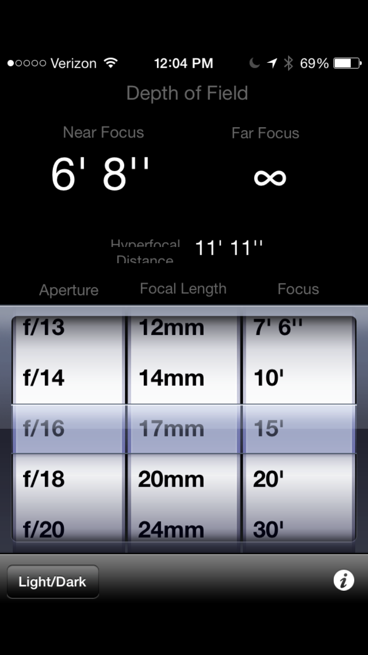 3. My Fuji xT-1 has a scale showing the dof and focal distance viewable in the LCD and view finder which is very useful to determine hyperfocal distance. By adjusting manual focus twist till the right end of the blue (focus range) band touches infinity. The focus distance, shown in white, is your hyperfocal distance. An iPhone app Tack Sharp, gives the hyperfocal distance for an APS-C sensor, given the focal length and aperture. The two, TS and Fuji, disagree considerably. At 18 mm focal length, f/16, Fuji says hyperfocal about 14 ft, min focus about 7 ft., TS says (for 17mm - doesn’t do 18) hyperfocal distance is 3.2 ft., near focus, 1.5 ft. Why? After contacting Rico Pfirstinger, author of a book on the XT-1, I now know why they differ. Tack Sharp by default uses a 19 micron CoC for the APS_C sensor, Fuji (according to Rico) uses 5 micron CoC for their camera calculation. Tack sharp lets you, in the info panel, adjust the COC. Set it to 5 micron and the Tack Sharp answer agrees a lot better with Fuji. I guess this means unless you need the precision of focus Fuji is trying to achieve don't believe the blue range of focus band. Another iPhone app, Lens-Lab agrees well with Tack Sharp. A Wikipedia article uses 19 micron for the CoC of a APS-C (Nikon) sensor. So what does this all mean? Here is the Tack Sharp for 5 micron CoC and for 19 micron