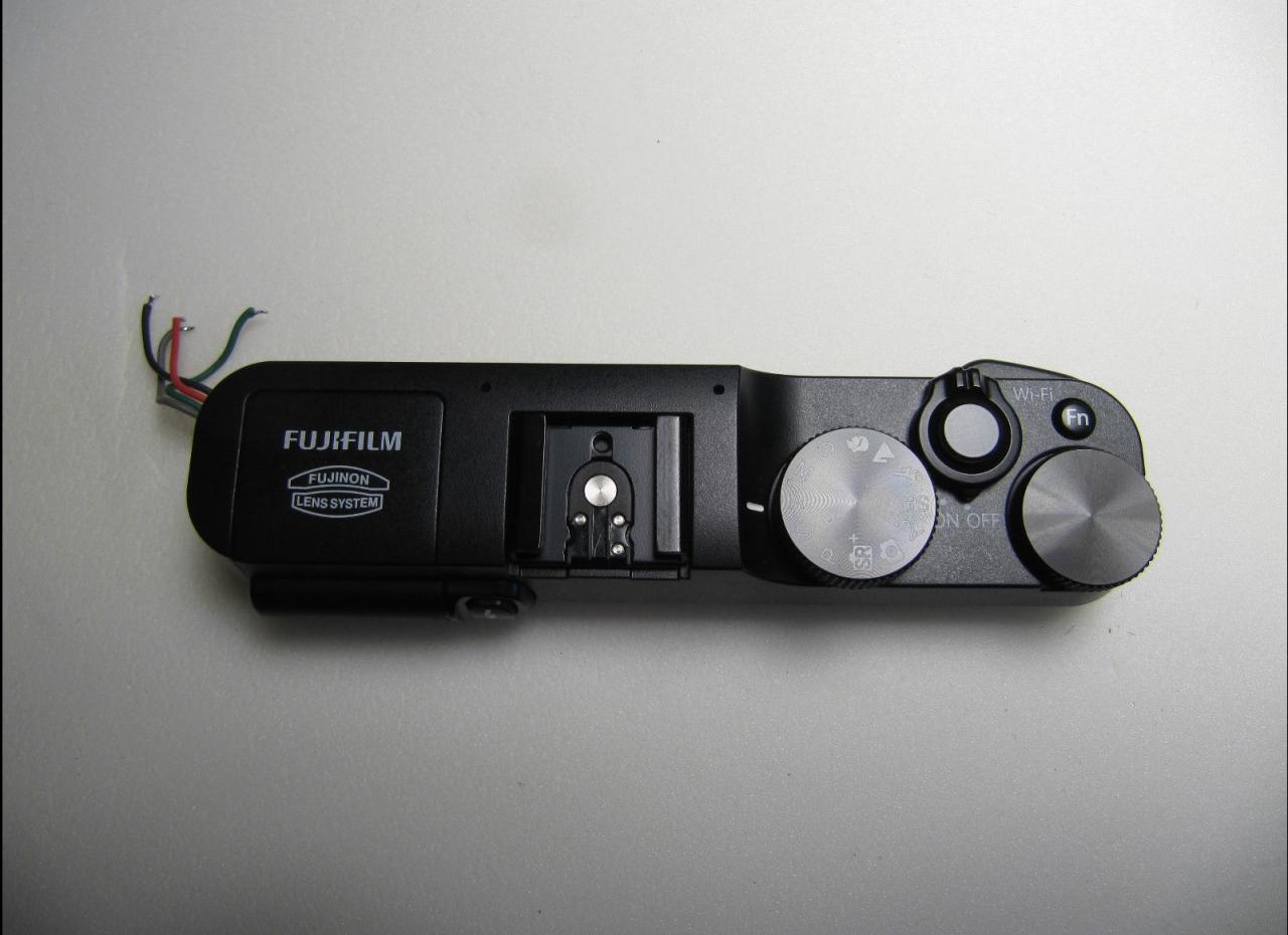 Uugh......a rather tricky problem. Generally, alcohol will clean up the oils in the tangerine. Warm water should be fine for the juices. Looking at the construction, all knobs and dials are probably removable from under the top cover. I. e. you'd have to remove the top cover to gain access to dismantle the dials for cleaning. Attached pics of an XA1 top cover for reference. Here's something about citric juices which you may want to know. It etches onto some surfaces and melt some plastics. Not sure how the X-T1 material will stand up against that. Send it in for cleaning?