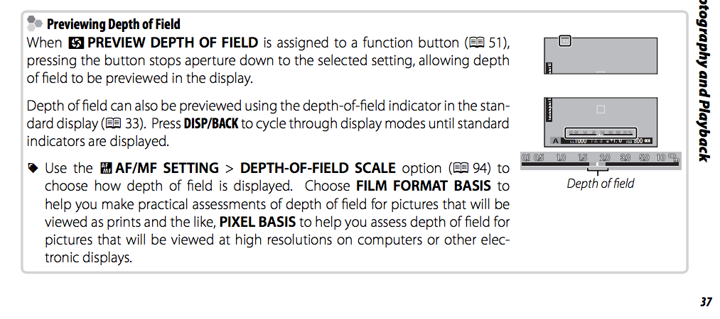 X-Pro2: Depth-Of-Field Scale, Film Format Basis vs. Pixel Basis, What's the difference? I've read what the difference is from the X-Pro2 Owner's Manual, but I still don't quite understand. Frankly, it's an extra option & setting which serves to confuse me a bit.. I've never heard or seen this option on any other camera until now, so not sure how to even use this really? Is there really that big of difference between how your files will render depth of field for print versus on screen? If somebody can shed some insight into this particular feature, thanks! Here's a screen shot of the excerpt from the manual included in this post.